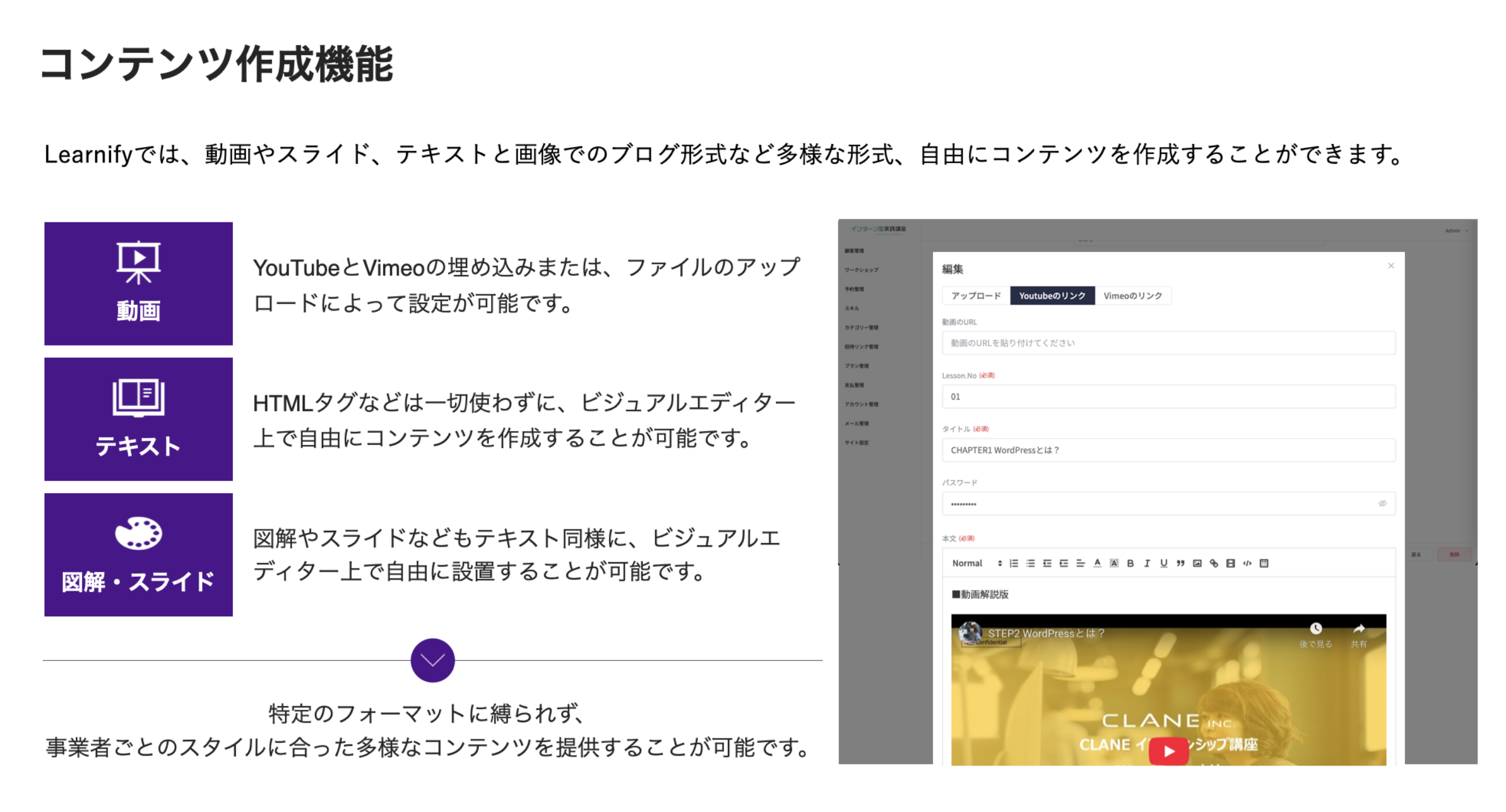 管理画面上での高度なコンテンツ作成や学習管理機能、テストの出題や課題提出、イベント募集機能など、eラーニングを構築する様々な機能が揃っており、低コスト・短期間で本格的なeラーニング環境を構築。